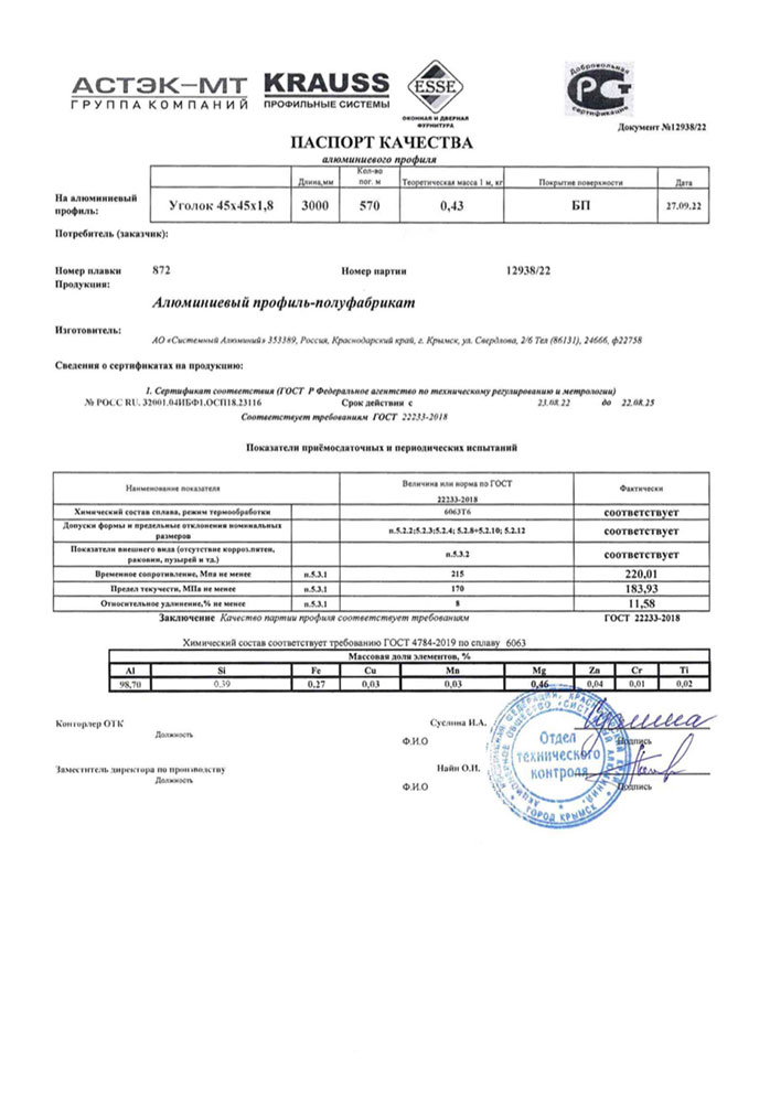 Уголок алюминиевый стандартного назначения АД, А0, АМг, АМц, АД31, Д16. Электротехнического назначения АД00, АД0, А7, А5Е, АД31Е, АД31. Термически не обработанные, мягкие (отожженные) и закаленные. Прессованные по ГОСТ 22233-2001 и ГОСТ 8617-81, с химическим составом по ГОСТ 4784-97. Отбор и подготовка проб по ГОСТ 24231-80.